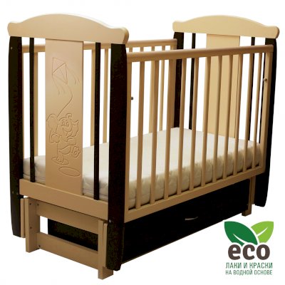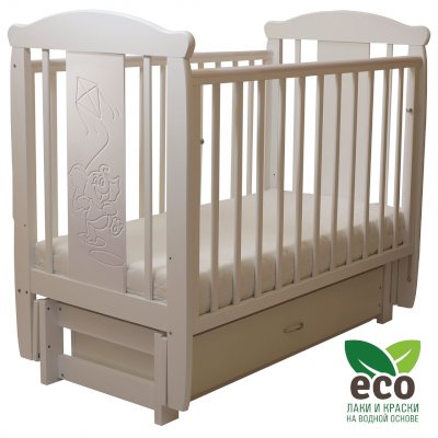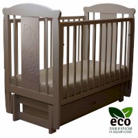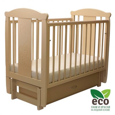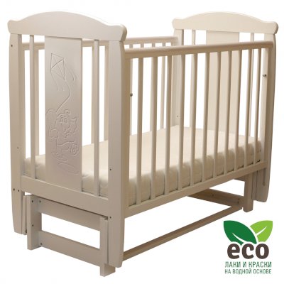 Кроватка декорирована фрезерным рисунком "Слоник". Уникальные фрезерные рисунки размером от 50 см на обеих спинках.