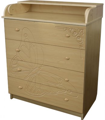 Комод Соня-Бабочка 80/4 имеет не только красивый вид, он функционален и эргономичен. В его четырех ящиках вы сможете разместить не только детские вещи, но и средства по уходу за новорожденным: присыпки, крема, подгузники, а также постельное белье.