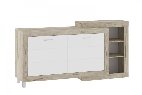 У комода комбинированные глухие фасады, которые крепятся на петли без доводчиков. Внутри-два отделения с полками. Полки изготовлены из ЛДСП цвета Дуб Сонома и выдерживают нагрузку до 5 кг каждая.