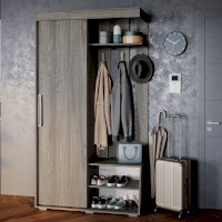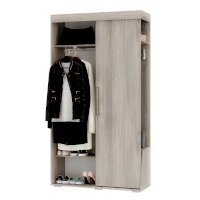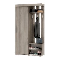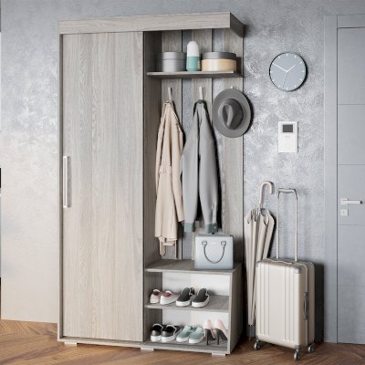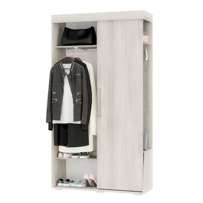 Современная прихожая «Зара», выполненная в спокойном цвете древесной фактуры ясень светлый, может гармонично вписаться в любой интерьер. Несмотря на свою компактность, прихожая имеет просторный шкаф с выдвижной штангой, антресольную полку для головных уборов, две открытых полки для обуви и удобные крючки для верхней одежды.
