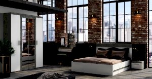 Современный четырёхстворчатый шкаф Инстайл выполнен в стиле одноименной модульной коллекции мебели. Модель состоит из четырех дверок, две из которых – зеркальные. Изделие выполнено в комбинации белого и цвета бетон. Внутреннее наполнение состоит из двух отделений со штангами, а также верхних и нижних полок для вещей. Стильный геометрические ручки украшают шкаф Инстайл.